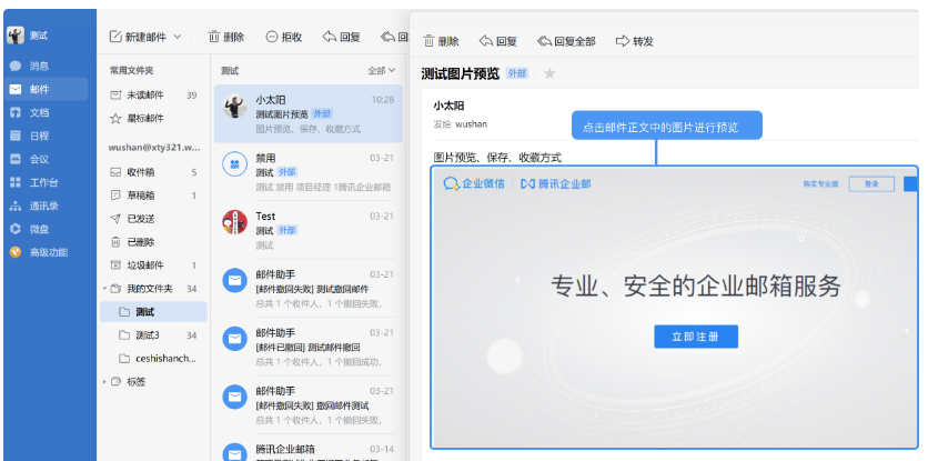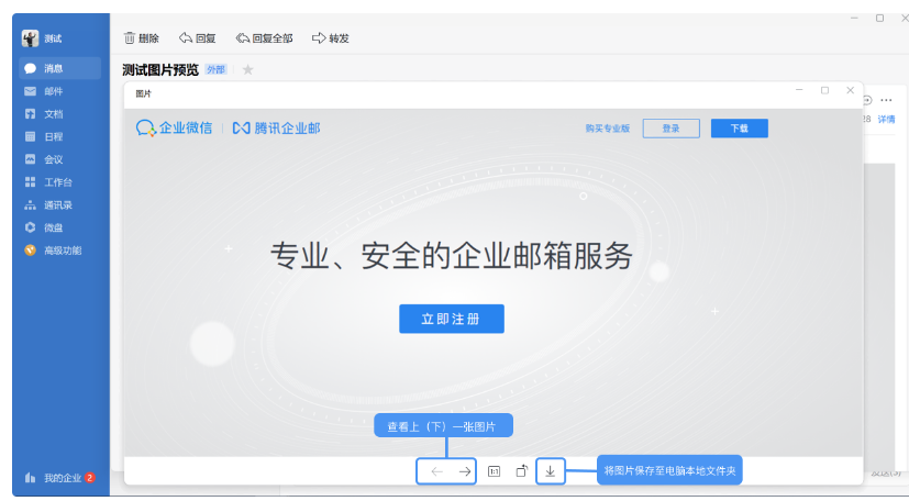 通过企业微信PC端查看邮件正文包含图片的邮件,支持点击正文中的图片进行预览(可在预览图片页面点击“←”或“→”查看上(下)一张图片;同时支持点击“↓”将图片保存至电脑本地文件夹等操作。