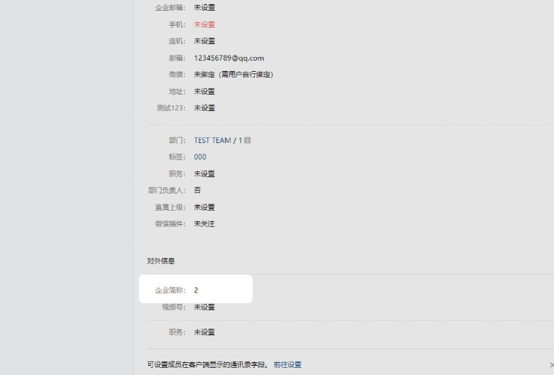 1.管理后台点击【通讯录->搜索成员、部门、标签】搜索到对应的成员,点击【成员详情->编辑->企业简称】