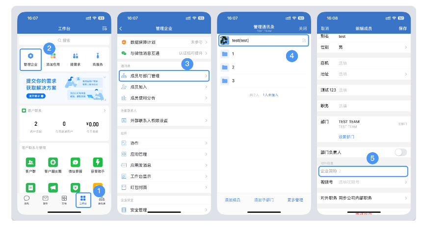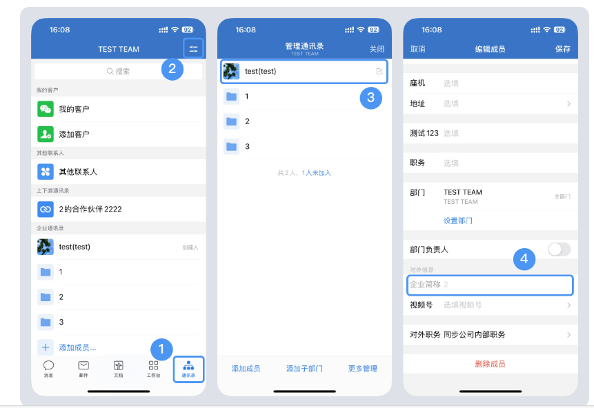2.管理员可在手机端点击【工作台->管理企业->成员与部门管理】或【通讯录->右上角->管理通讯录】找到对应成员,点击成员信息编辑企业简称。