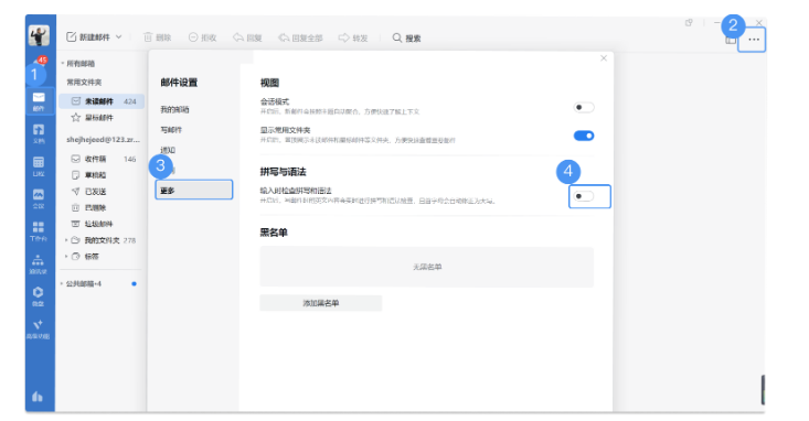 1、【企业微信电脑客户端->邮件右上角“···”->邮件设置->更多->拼写与语法】开关可以选择开启或关闭英文拼写和语法检查功能;开启后,书写邮件内容时会实时进行英文拼写和语法检查。