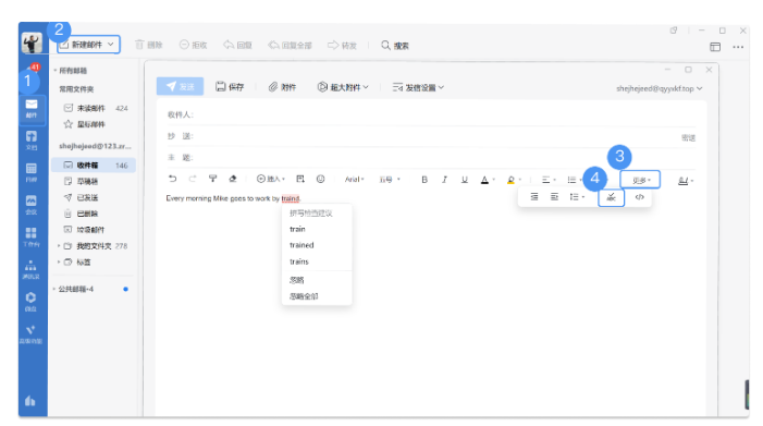2、【企业微信客户端->新建邮件->更多->拼写与语法】点击后进行全文的英文拼写和语法检查,对于拼写有误的单词,系统会标注且提示修改建议,可根据“拼写检查建议”选择“修改”或“忽略”。