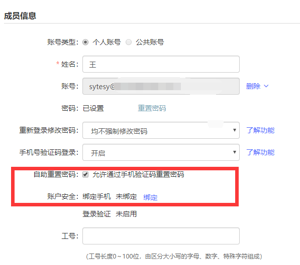 在成员信息中可以解绑手机号码,可以自行绑定手机号码给员工使用