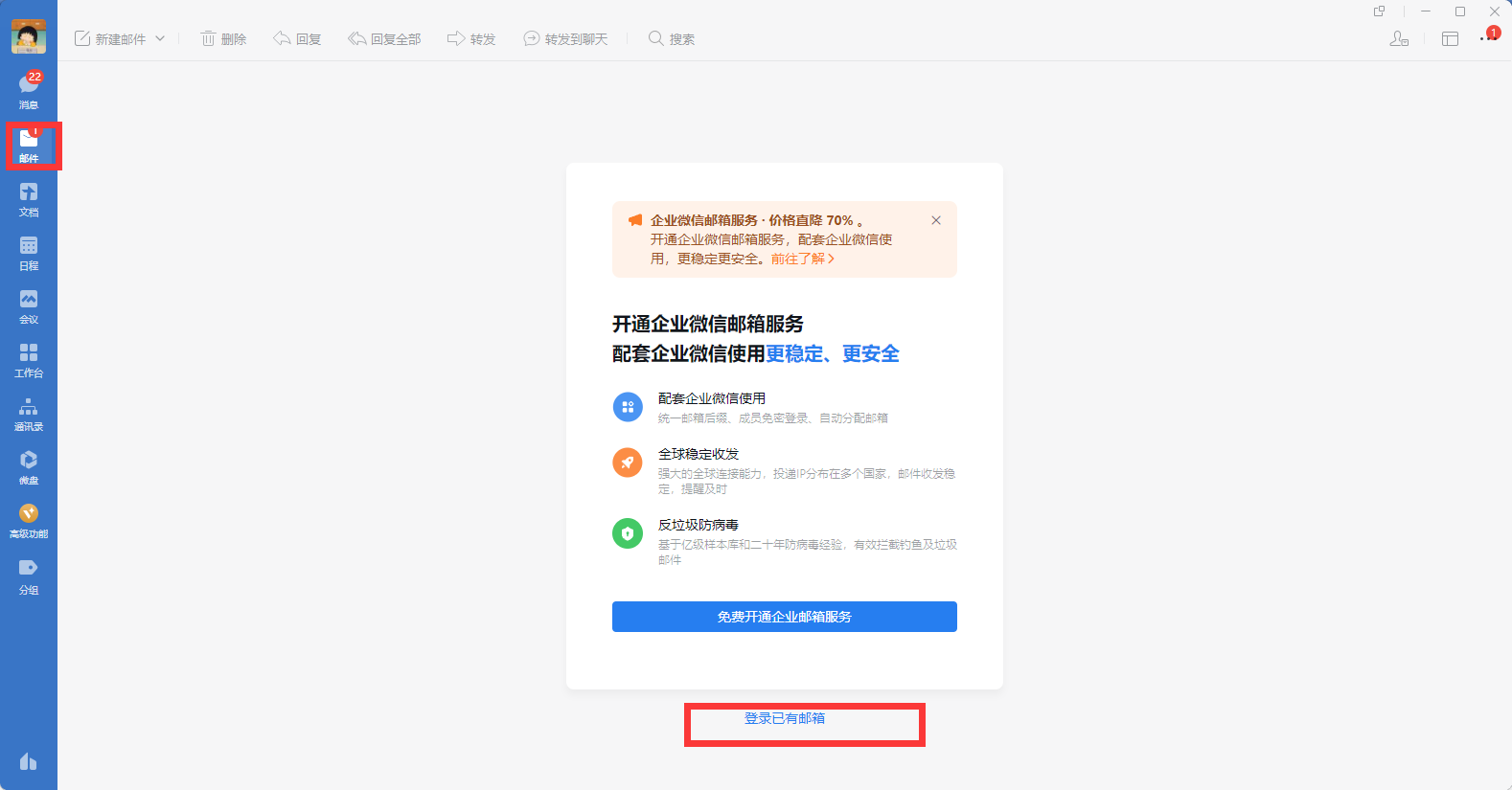 未有绑定企业域名,在使用企业微信体验域名邮箱状态,【邮件】入口才支持绑定工作邮箱