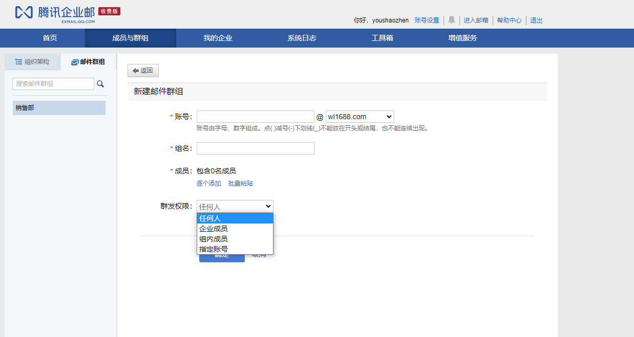 【可创建邮件列表的总数】,表示允许成员创建邮件列表的数量上限,超过后则无法继续创建。
