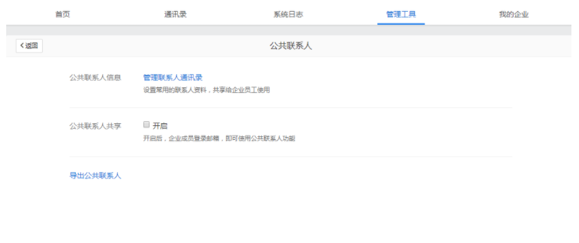 开启后,企业成员登录邮箱可使用公共联系人通讯录功能。也支持允许部分企业成员/部门使用公共联系人通讯录。