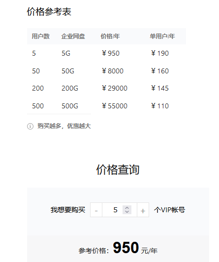 腾讯企业邮箱价格一般根据购买邮箱用户数量、购买服务年限等进行收费,5个vip账户起购,开通年限最低为一年,所以腾讯企业邮箱最小购买套餐为5个vip用户,最低950元1年,5个数量以上根据需要来采购,如果后期公司需要更多的vip账号,可以随时扩容。