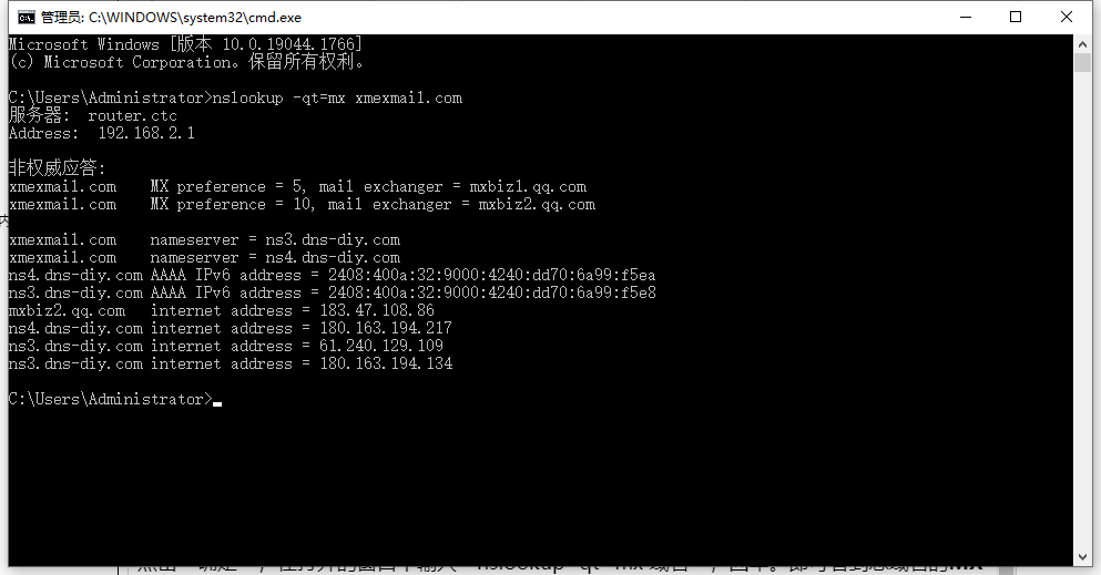 点击“确定”,在打开的窗口中输入“nslookup -qt=mx 域名”,回车。即可看到您域名的MX记录。