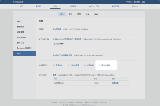 可登陆【企业微信管理后台->协作->邮件->设置->退出时跳转】输入指定地址(比如公司网站、个性化登陆页面等),那么成员登录邮箱后选择右上角“退出”便会退出到指定地址。